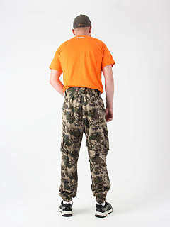 Пояс брюк полностью эластичный, дополнен шлевками. Низ брюк собран на резинку. Два вместительных объемных набедренных кармана на молниях и два кармана у пояса без застежки.