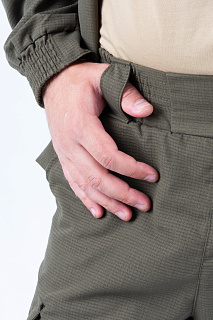 Пояс брюк полностью эластичный, дополнен шлевками. Низ брюк собран на резинку. Два вместительных объемных набедренных кармана на молниях и два кармана у пояса без застежки.