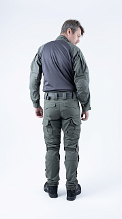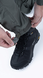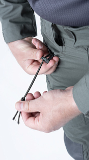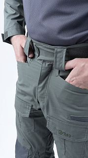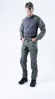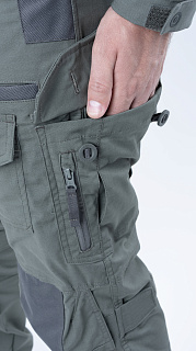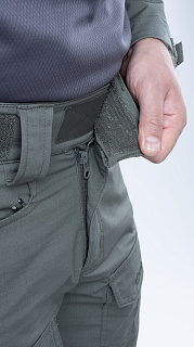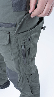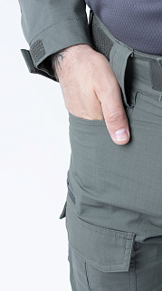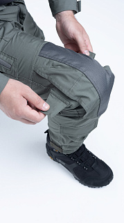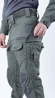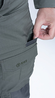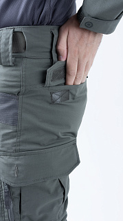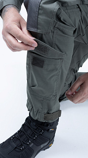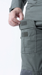 Брюки усилены в области колена двойным слоем ткани. Большие накладные карманы у пояса. Пояс брюк собран на широкую эластичную резинку, есть шлевки для ремня. Внизу брюки собраны на резинку.