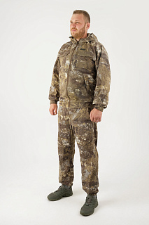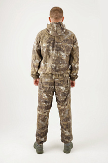 Костюм оснащен специальными ловушками для клещей – на рукавах, куртке, брюках. Сетка накомарника съемная и легко убирается в потайной карман на груди. Куртка утягивается по низу.Рукава оснащены плотными трикотажными манжетами. В куртке один большой карман-кенгуру с листочками на липучках.